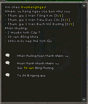 | Bao Vạn Đồng | Thời gian: cả ngày Mỗi 10 nhiệm vụ thưởng : 1 uy danh 1 triệu điểm kinh nghiệm 1 Huyền Tinh 6 -5 vạn đồng khóa - 10 vạn bạc khóa - 5 vạn tích lũy nạp thẻ |